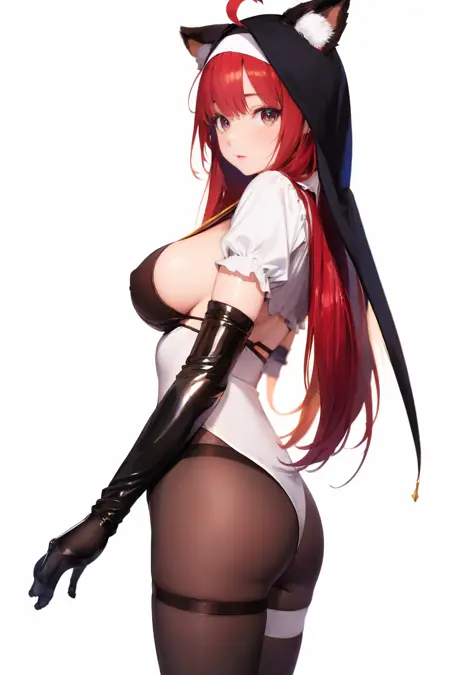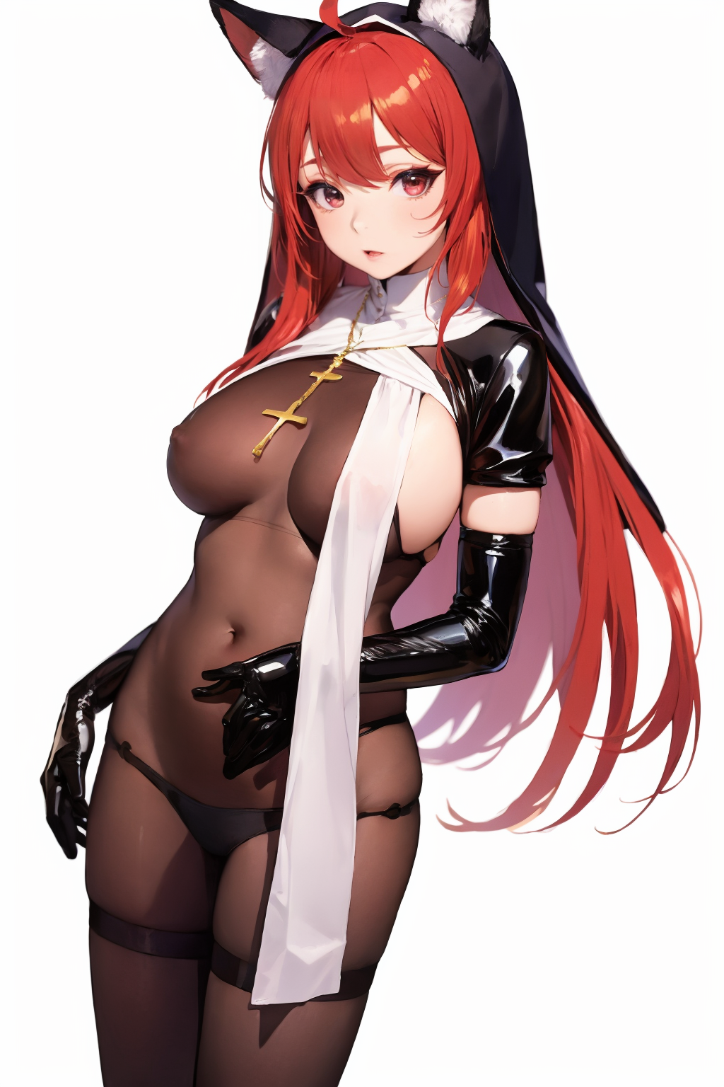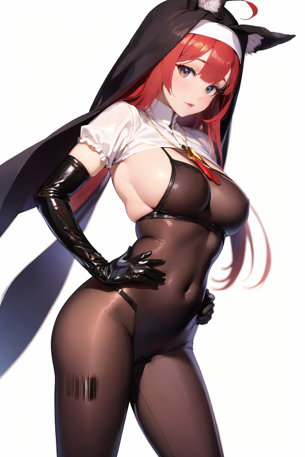 - 13878w clothing,white front hanging sash,black short sleeve,see-through,bodystocking,breasts,gloves,elbow gloves,cross necklace,jewelry,no panties,necklace,covered nipples,nun,
