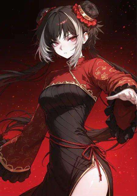 2. nose, long hair, black hair, hair ornament, red eyes, very long hair, twintails, white hair, grey hair, multicolored hair, sidelocks, hair bun, mole, two-tone hair, streaked hair, mole under eye, double bun,