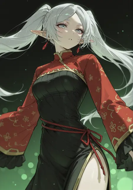 long sleeves, dress, frills, wide sleeves, chinese clothes, frilled sleeves, china dress, side slit, two-tone dress, red dress, black dress,