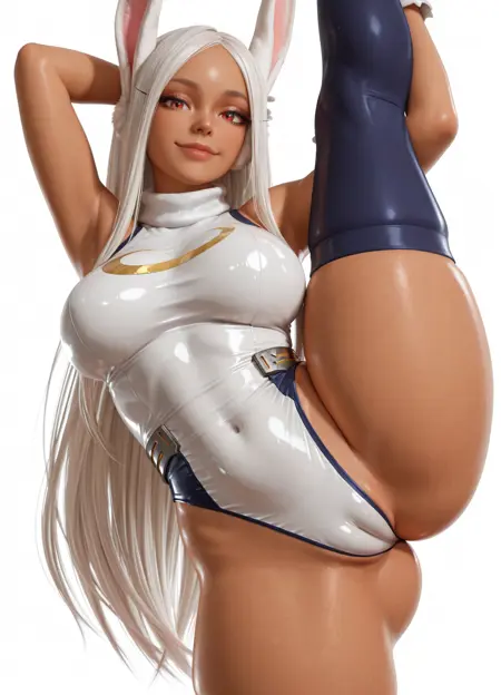 深色皮肤、动物耳朵、长发、兔子耳朵、过膝袜、紧身衣、红眼睛、手套、白发、高腿紧身衣、兔子女孩、白色手套、非常长的头发、白色紧身衣、无袖高领紧身衣、无袖、高领、无袖高领、蓝色过膝袜、高领紧身衣!