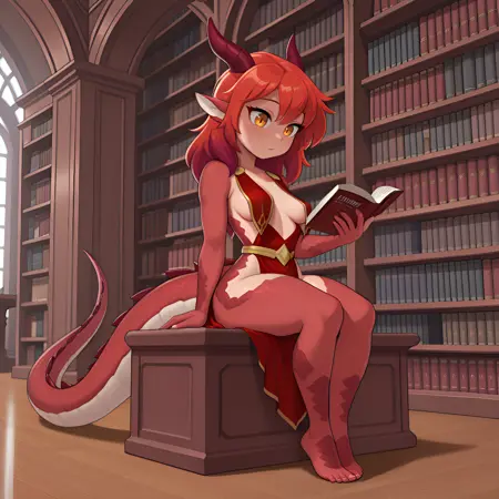 chruri, dragon girl, dragon tail, dragon horns, fed hair, red dress, breast curtains, red scales,