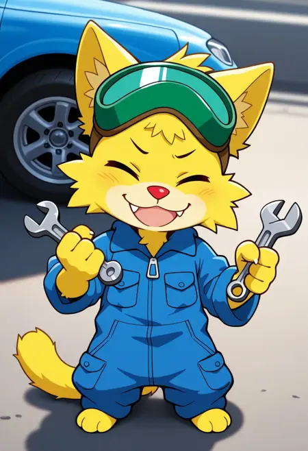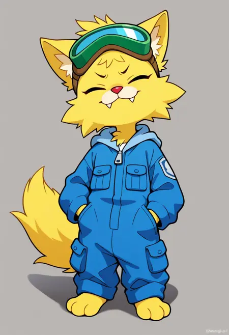 Cat, solo, male, yellow fur, cheek tufts, pocket, green goggles on head, solo, closed_eyes, pocket, blue jumpsuit, head tuft, tan mouth, red nose, fang