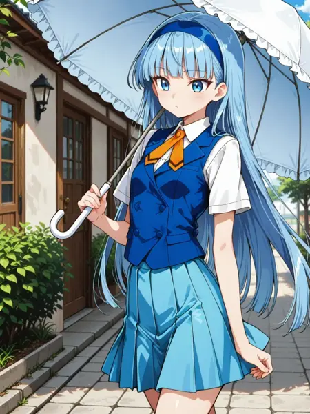 ryuuzaki umi, MKR_UMI_SU, blue hair, blunt bangs, long straight hair, blue hairband, blue eyes, flat chest, blue blazer, white dress shirt, orange cross tie, blue pleated skirt, black pantyhose