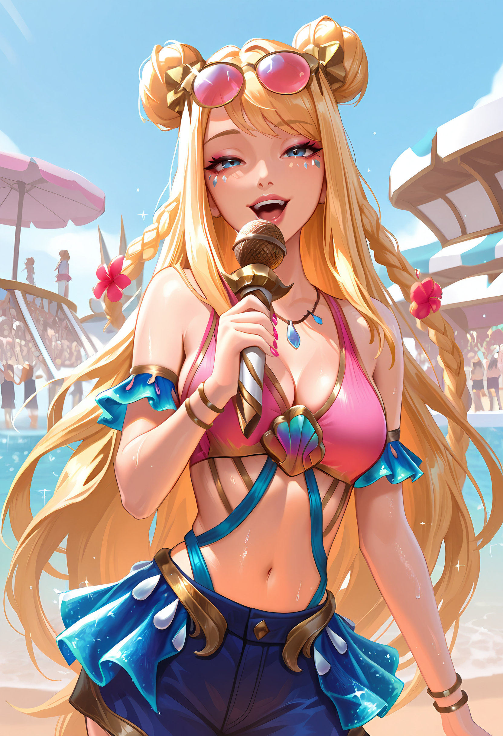 osseraphineil, medium breasts, blonde hair, double bun, very long hair, twin braid, blue eyes, facial mark, eyewear on head, hair ornament, tinted eyewear, navel, necklace, pink swimsuit, blue shorts, arm cuffs, pink nails, bracelet, flower braid, makeup, lips, shell,