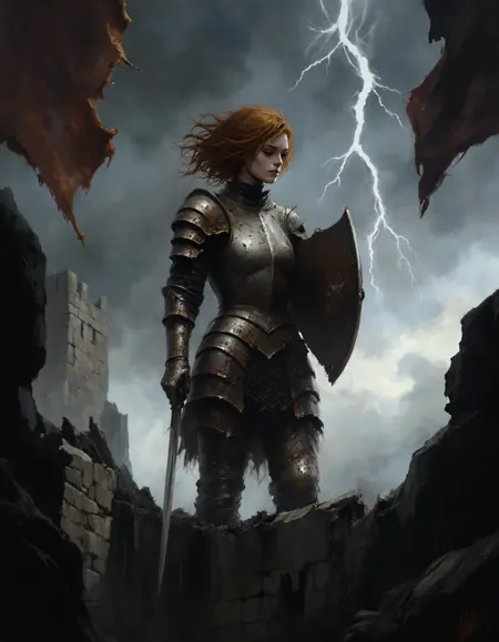 Example Prompt: didngnsnddrmscps_, digital fantasy art,_ A male knight in weathered armor stands against a stone wall, holding a staff in one hand. His full helmet obscures his face, giving him a mysterious presence. The background is a rough, textured stone wall with hints of muted blue and brown hues. The knight's stance is slightly angled, with shadows casting an ominous tone. The scene conveys a sense of solitude and vigilance, painterly painting style, moody atmosphere, chiaroscuro lighting, muted earth tones.
