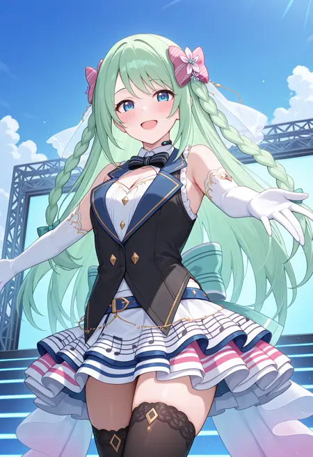 - pchikdol, 쌍꼬리Matchers, 웨딩 베일, 헤어 플라워, 헤어 리본, 핑크 리본, 줄무늬 리본, 어깨 노출, 아이돌 복장, 소매 없는, 검정 버스터, 파란 라펠, 검정 넥타이, 흰 셔츠, 가슴 절개, 팔꿈치 장갑, 흰 장갑, 파란 벨트, 흰 치마, 다채로운 치마, 하프 스커트, 음표 프린트, 그라데이션 스커트, 핑크 스커트, 파란 스커트, 흰 스커트, 프릴 스커트, 레이어드 스커트, 검정 히프하이, 배 체인, 뒤 리본, 아쿠아 리본,