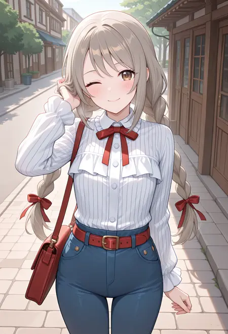 - 흰 셔츠, 긴 소매, 세로 줄무늬 셔츠, 프릴 셔츠, 빨간 리본, 빨간 벨트, 파란 바지,