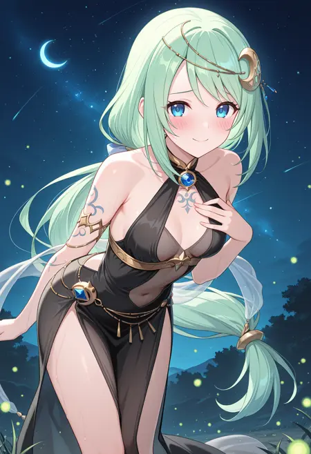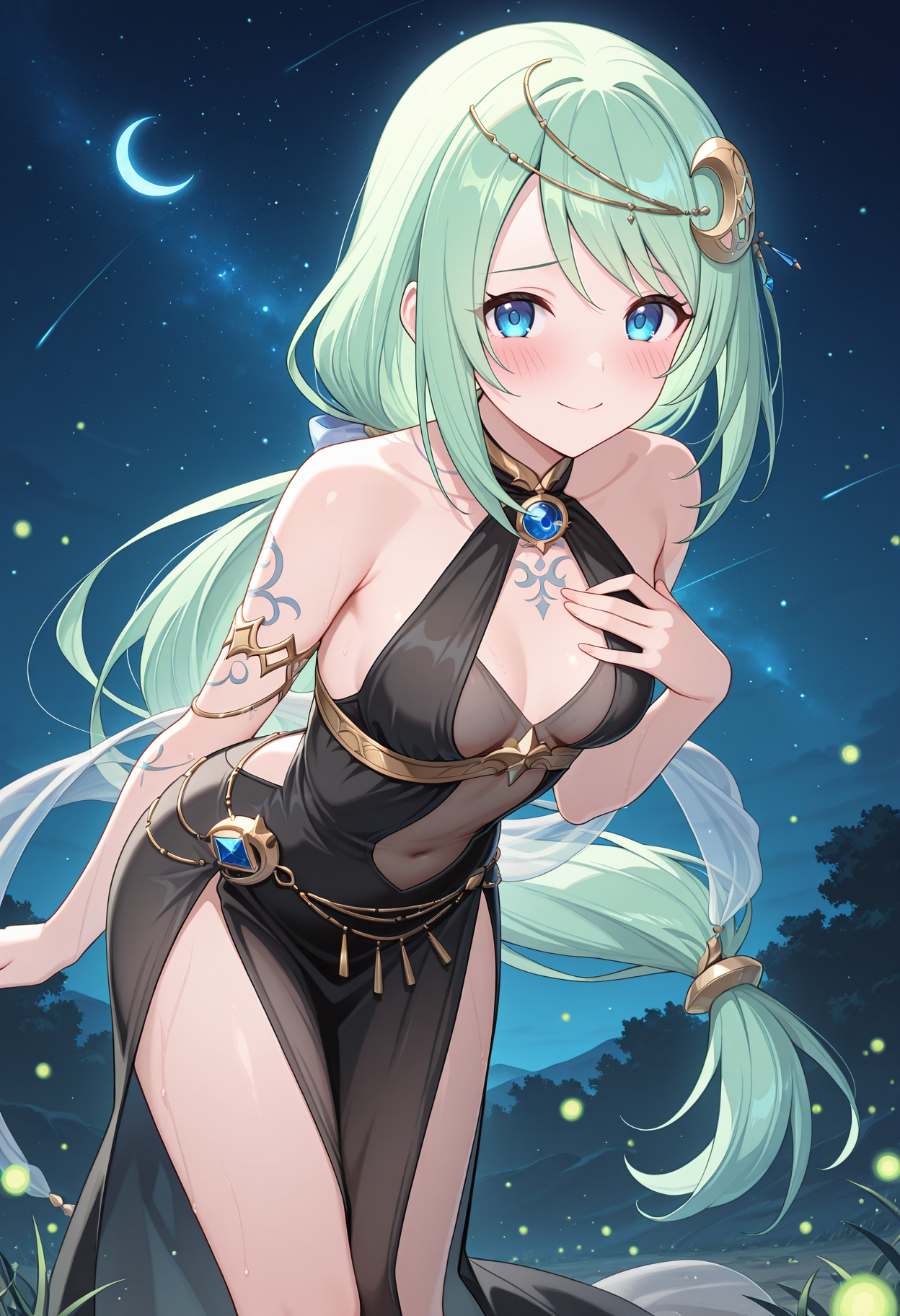 - pchikcer, 티아라, 낮게 묶은 토끼꼬리, 초승달 헤어 장식, 초승달, 금 초커, 보석, 어깨 노출, 할터 드레스, 검은 드레스, 투명한 드레스 레이어, 중앙 절개, 유방 아래, 문신, 팔찌, 투명한 샬, 배 체인, 측면 슬릿, 골반 커튼,