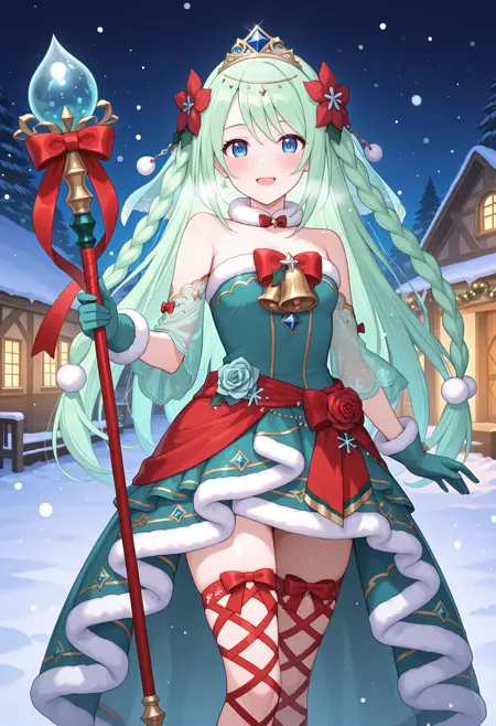 - pchikmas, 산타 복장, 쌍꼬리Matchers, 베일, 헤어 플라워, 꽃, 티아라, 왕관, 털 장식 초커, 어깨 노출, 털 장식 드레스, 종, 스트랩리스 드레스, 아쿠아 드레스, 분리형 소매, 투명한 소매, 털 장식 장갑, 아쿠아 장갑, 장미, 빨간 리본, 허리 주변 빨간 옷, 레이어드 드레스, 팜팜 헤어 장식, 하이-로 스커트, 팜팜 (옷), 다리 매듭,