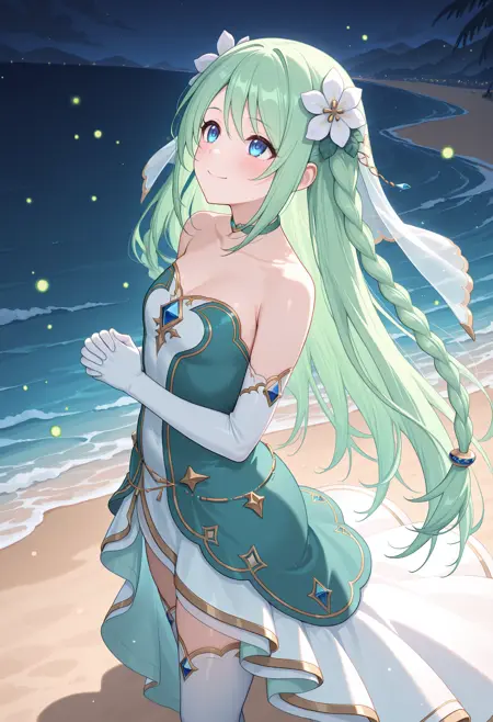 pchikdef, 쌍꼬리Matchers, 헤어 플라워, 웨딩 베일, 녹색 초커, 어깨 노출, 투톤 드레스, 스트랩리스 드레스, 아쿠아 드레스, 흰 드레스, 금장식, 팔꿈치 장갑, 흰 장갑, 보석, 배 체인, 히프하이, 하이-로 스커트,