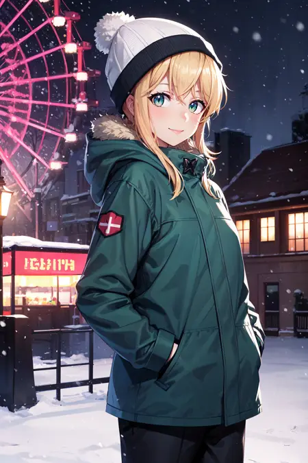 衣装2:グリーンのレオタード、エルボーグローブ、スカート、縞模様のタイツ