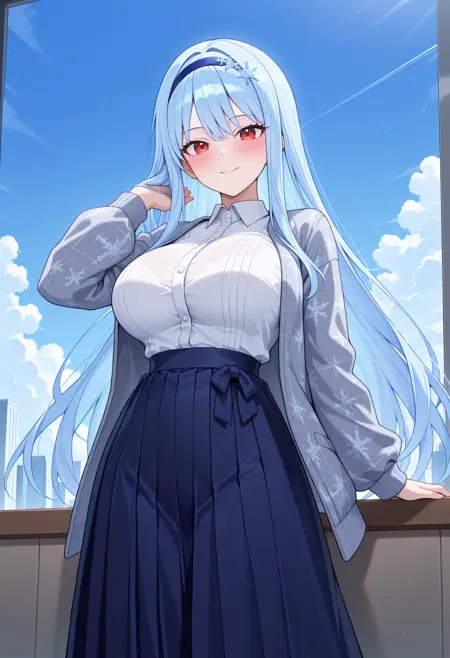 - hiorincasl, 蓝色发带,雪花发饰,白色衬衫,有领衬衫,蓝色裙子,长裙,蓝色夹克,灰色夹克,印花夹克,