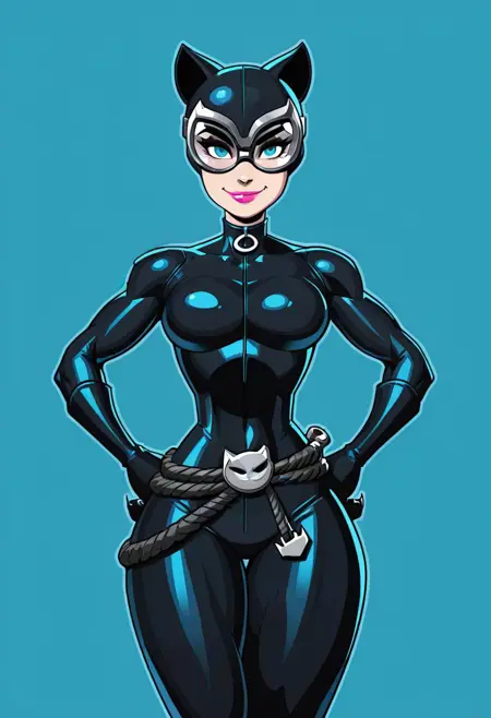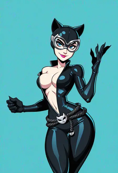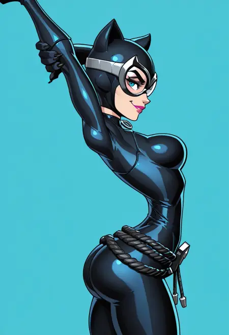 1girl, solo, catwoman, black mask, blue eyes, goggles, lipstick, black bodysuit, turtleneck, o-ring zipper, black gloves, claws, rope belt, cat belt buckle, black boots,