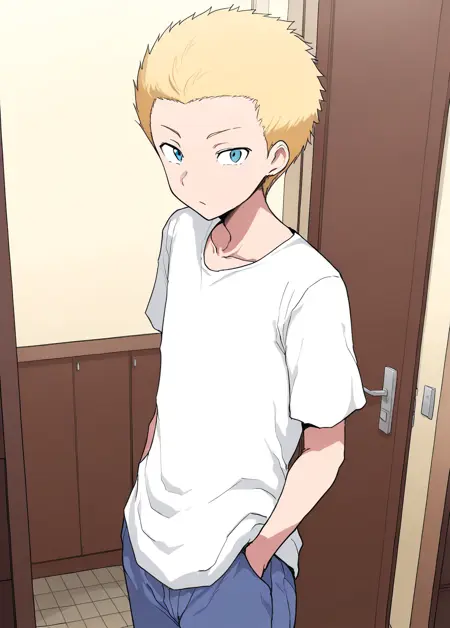 1boy, male focus, blonde hair, short hair, blue eyes, spiked hair