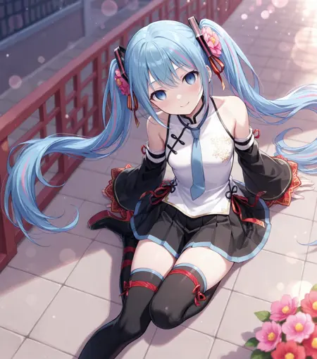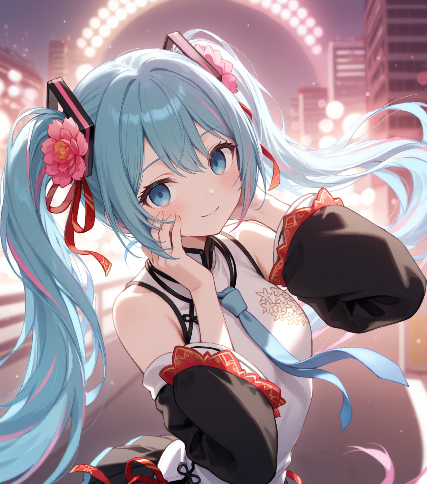 非常长的蓝绿色头发,蓝绿色眼睛,宽大的黑色无袖衣袖,无袖上衣,中式服装,领带,发饰,粉色头发花,双马尾,红色丝带,百褶黑裙,蓝色领带,白色衬衫,露肩,发丝渐变,绝对领域,黑色过膝袜,大腿靴,腿部丝带,高跟靴,