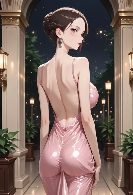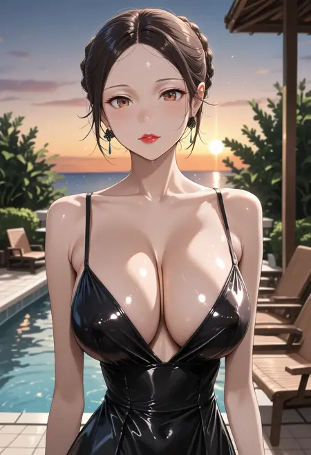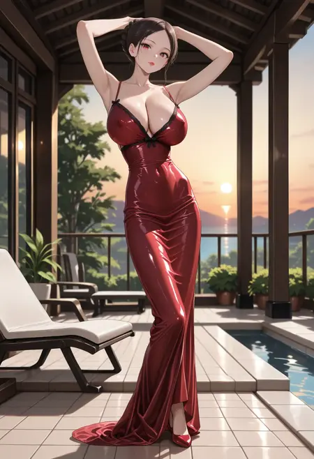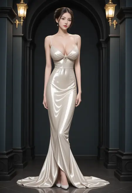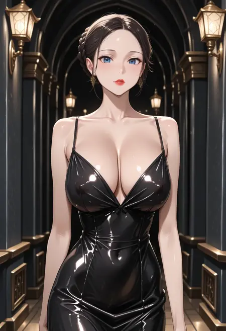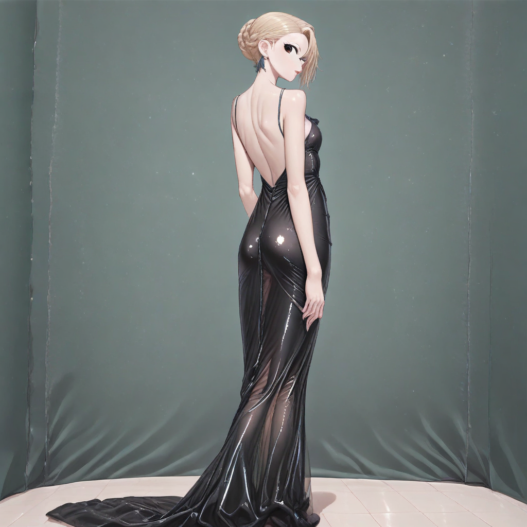 D001_NightGown, see-through, satin black dress, glossy long dress,