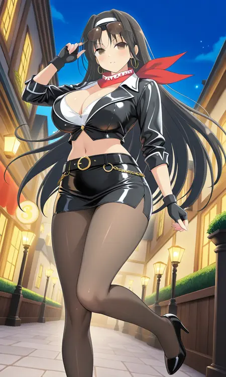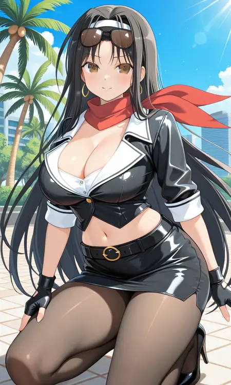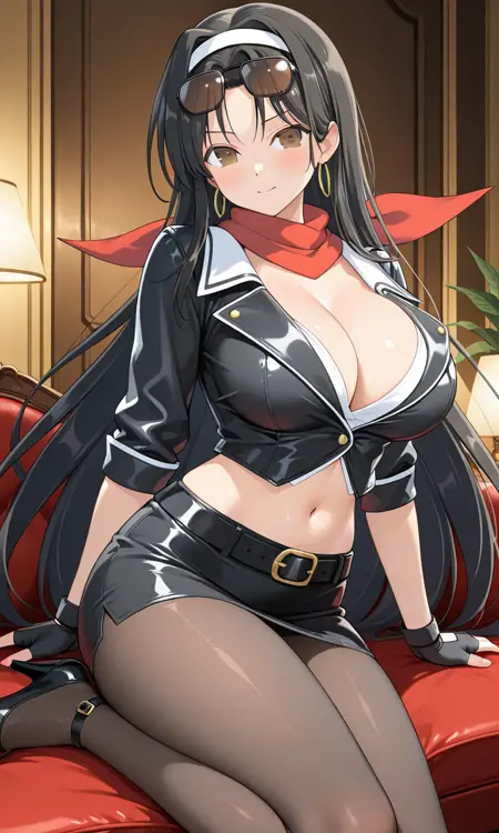 자스민(센란 카구라), 갈색 눈, 긴 검은 머리, 헤드밴드, 선글라스, 고리 귀걸이, 빨간 스카프, 큰 가슴, 허벅지, 자스민_블랙, 검은 재킷, 흉부 노출, 흰 칼라, 검은 손가락 없는 장갑, 검은 치마, 넓은 검은 벨트, 팬티스타킹, 배꼽, 검은 하이힐