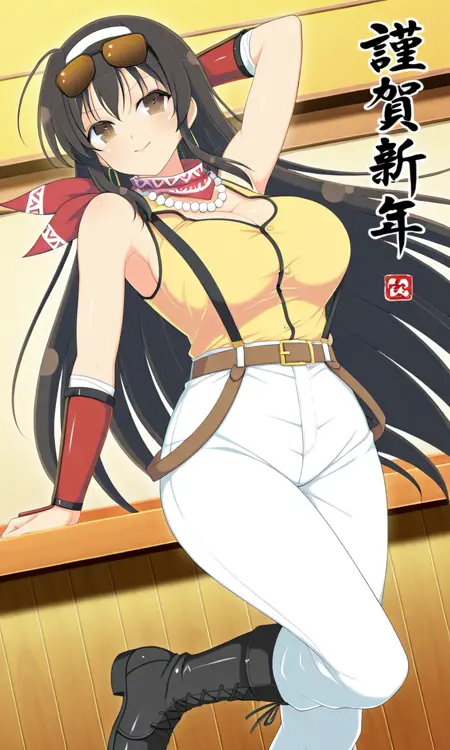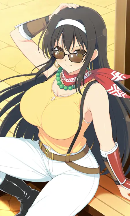 자스민(센란 카구라), 갈색 눈, 긴 검은 머리, 헤드밴드, 선글라스, 고리 귀걸이, 빨간 스카프, 큰 가슴, 자스민_신노비, 구슬 목걸이, 노랑 티셔츠, 소매 없음, 스트랩, 전완 보호대, 거대한 검은 벨트, 갈색 벨트, 흰 바지, 검은 부츠