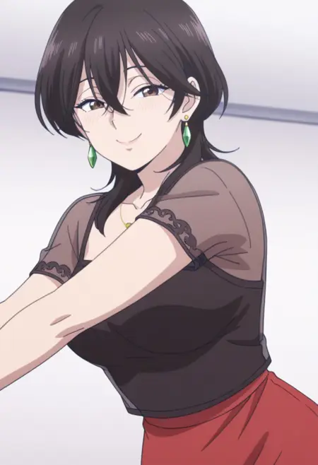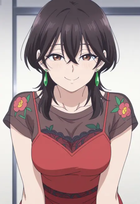 現在の外見:赤いドレス、ジュエリー、短い袖、イヤリング、長いスカート、赤いスカート、透け感、透け感のあるシャツ、透け感のある袖、黒いキャミソール、サンダル、花柄プリント