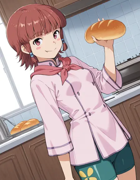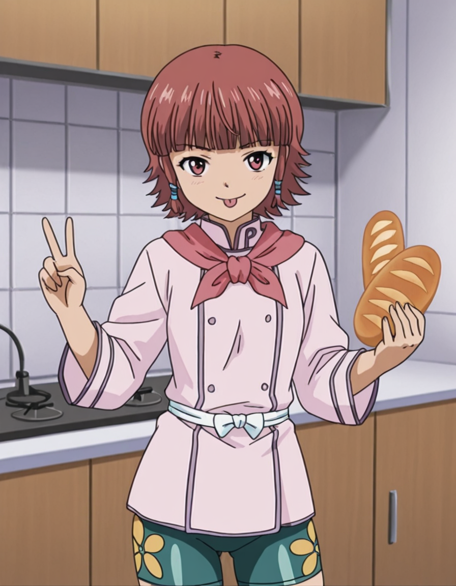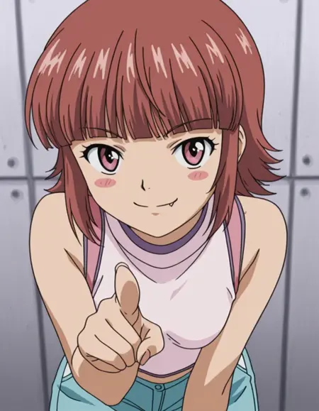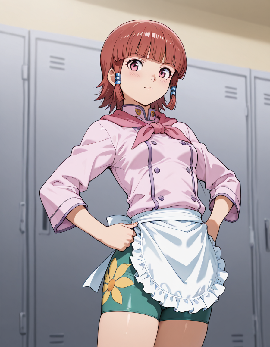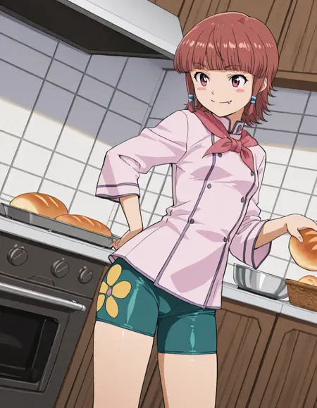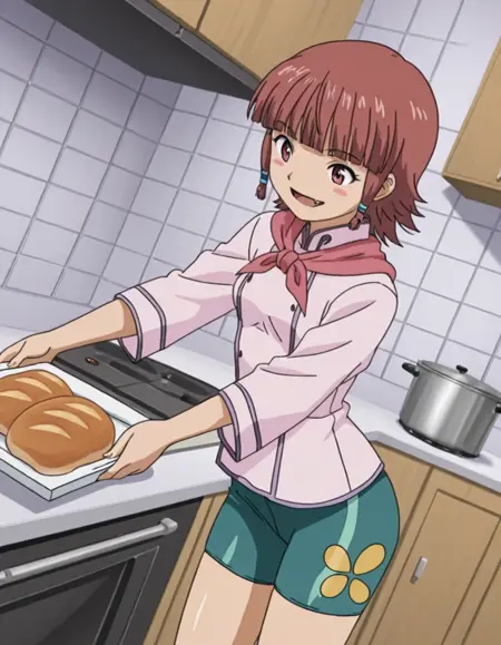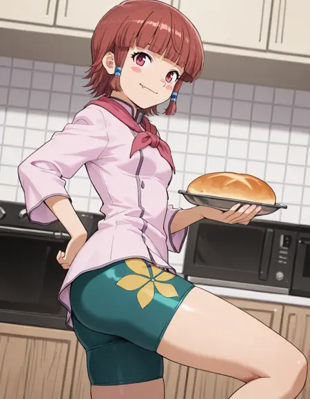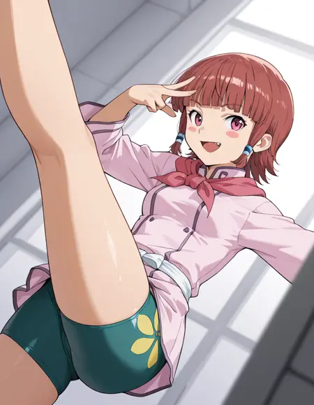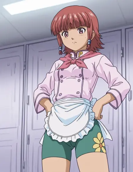 トレーニングされたプロンプト:m1zun0, mizunoazusagawa, 短い髪, まっすぐな前髪, 赤毛, 粉色の目, Pantasiaユニフォーム, 緑の自転車用ショートパンツ