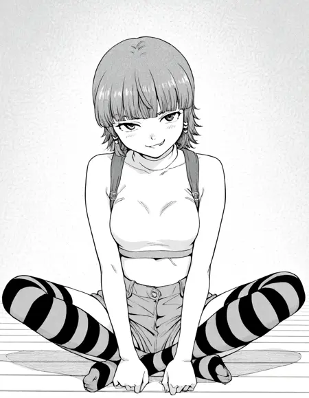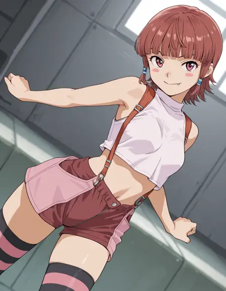 衣装:m1zun0, mizunoazusagawa, 短い髪, まっすぐな前髪, 赤毛, 粉色の目, カジュアル衣装, 横縞の太もも, サスペンダー