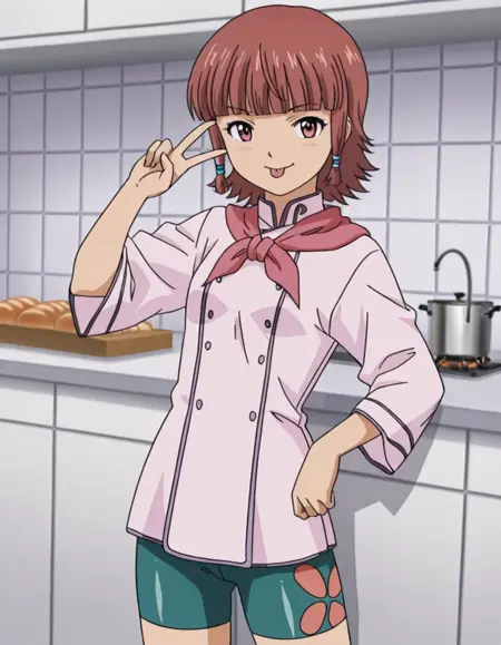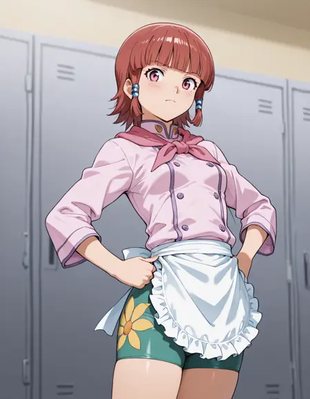 학습된 프롬프트: m1zun0, mizunoazusagawa, 단발, 앞머리, 빨간 머리, 분홍색 눈, Pantasia 유니폼, 녹색 자전거 반바지