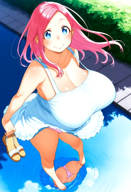 OkitaKyoko, ピンクの髪, 長い髪, 青い目, tareme, (ふくよか:0.8), 大きな胸, 厚い太もも, 成熟した女性,