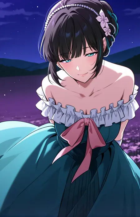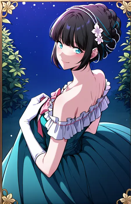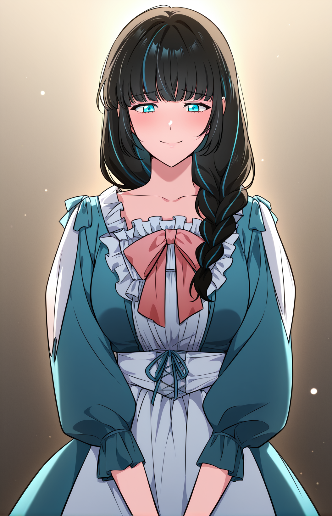 에리나, 1소녀, 솔로, 연한 파란 눈, 검은 머리, 파란 줄무늬, 긴 머리, 곧은 머리, 앞머리 전체, 긴 옆머리, 위로 땋은 머리, 옆쪽 땋은 머리 묶음, 꽃 모양 머리 장식, 진주 머리 장식, 장식용 머리띠,