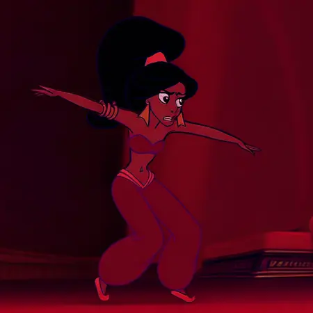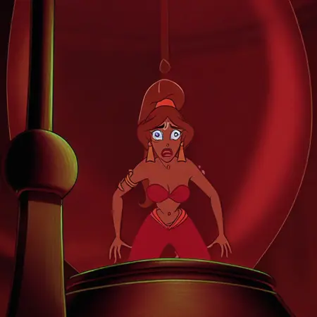 tiara, bandeau, harem pants, slave jasmine, inside giant hourglass, giant hourglass, yellow curly shoes, snake armlet