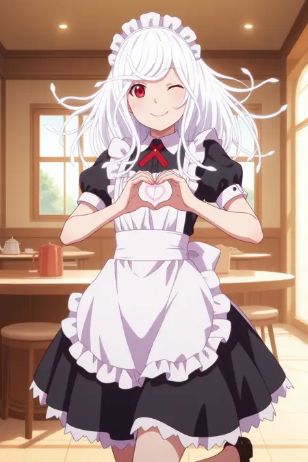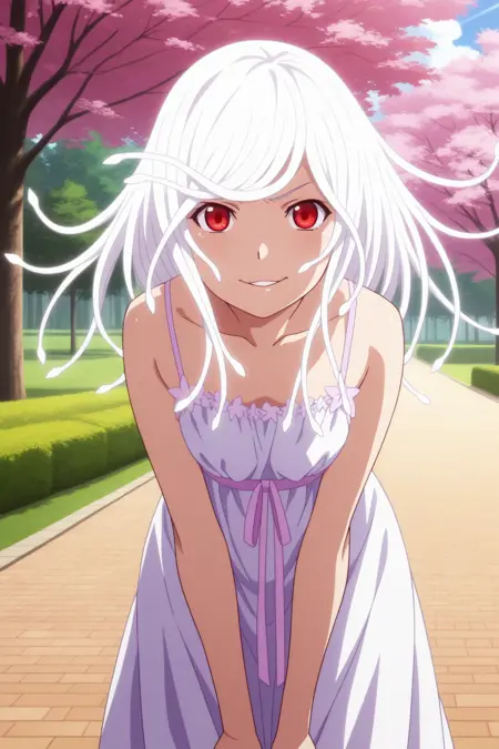 bbnadeko, 红色眼睛, 白色头发, 蛇发, snakec1, 白色连衣裙, 细肩带, 粉色丝带, 动漫着色,