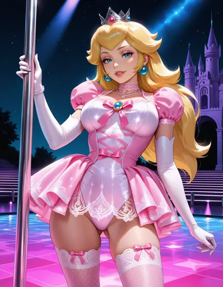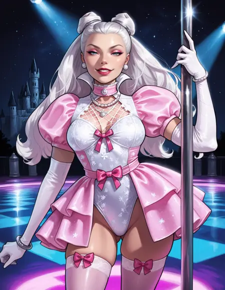 dr3ss, silver crown, cross-laced_clothes, patterned clothing, leotard, necklace, glitter dress, sequins, string of pearls, mesh top, chiffon, silver crown, pink dress, multicolored dress, ornate dress, puffy short sleeves, bow, ribbon, chest bow, short skirt, elbow gloves, lace choker で呼び出してください