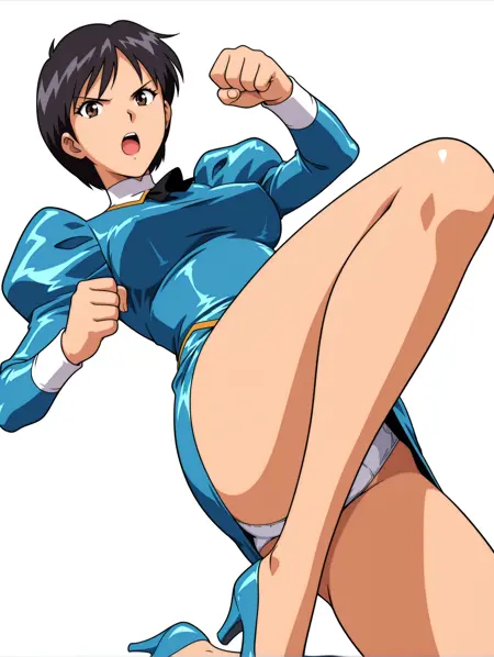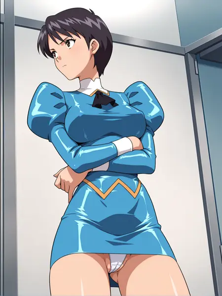 衣装ワード  ・b_clothes,black ascot,blue dress,juliet sleeves,long sleeves,blue pencil_skirt,white panties,no socks,blue high heels,
