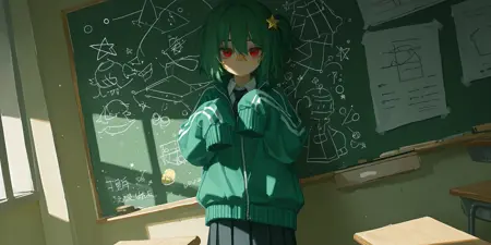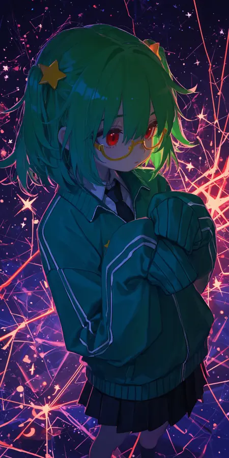 发饰, 夹克, 眼镜, 裙子, 百褶裙, 星星\(符号\), 袖子超过手腕, 半框眼镜, 袖子超过手指, 运动夹克, 下框眼镜, 星星发饰, 宽松衣服, 黄框眼镜, 带领子的衬衫, 领带,