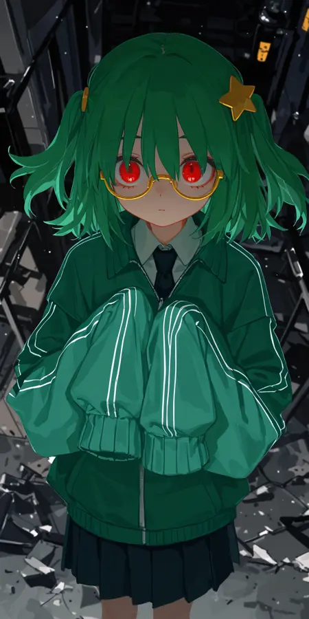 髪飾り, ジャケット, メガネ, スカート, プリーツスカート, 星(記号), 袖が手首より長い, セミリムレスメガネ, 袖が指先より長い, トラックジャケット, アンダーリムメガネ, 星型の髪飾り, オーバーサイズの服, 黄色フレームのメガネ, カラー付きシャツ, ネクタイ,