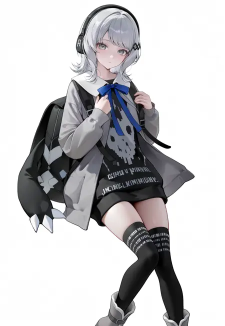sailafeimucloth, grey jacket,black shirt,print shirt,neck ribbon,print legwear,black thighhighs,blue ribbon,headphones,grey boots,headphones,backpack,animal bag