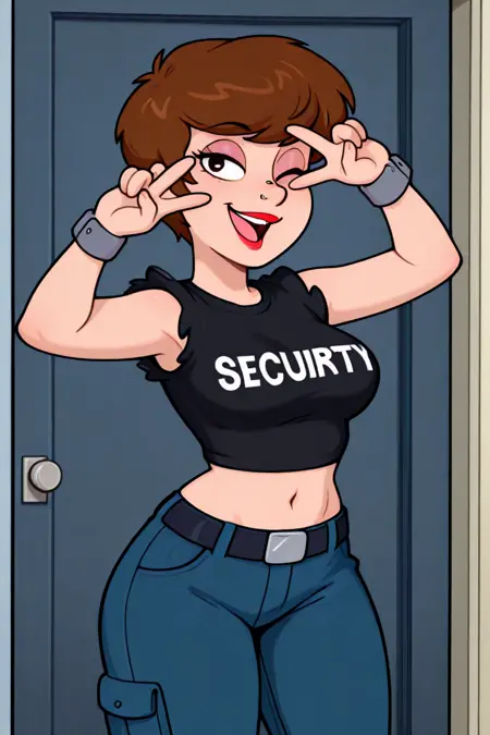 short brown hair, pixie cut, red lips, makeup, lipstick, nose piercing, medium breasts, black sleeveless navel crop top with the word security written on it, midriff, grey cuffs, belt, blue denim pants, black high-heel boots