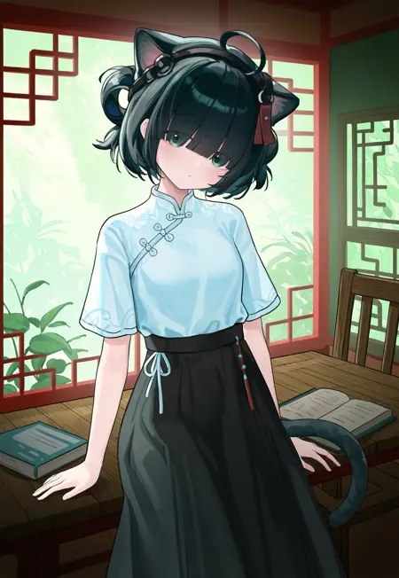 liuqianqiu,1girl,ahoge,black hair,blunt bangs, hair over eyes,hair rings, short hair,cat ears, ahoge, hair ornament,black hairband,green eyes, cat tail,