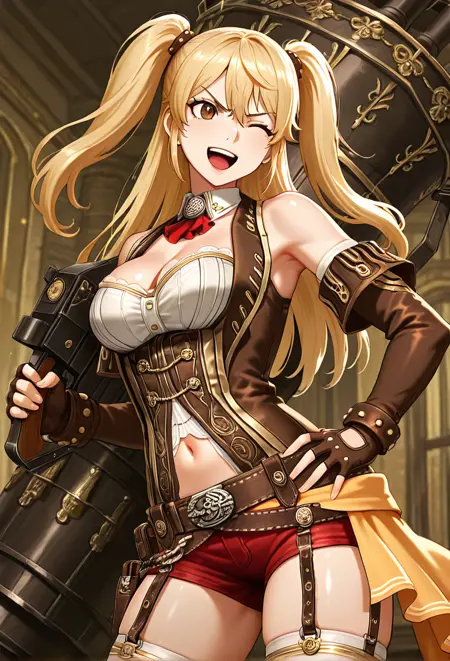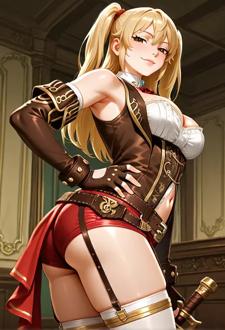 csclaire_(granado_espada), 1girl, 单人, 金发, 长发, 双马尾, 高双马尾, 棕色眼睛, 嘴唇, 挺胸, 分离式衣领, 裸露肩膀, 武器, 分离式袖子, 手套, 肘部手套, 无指手套, 肚脐, 过膝袜, 短裤, 红色短裤, 短款短裤, 腰带, 白色过膝袜, 吊带袜,