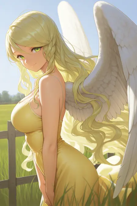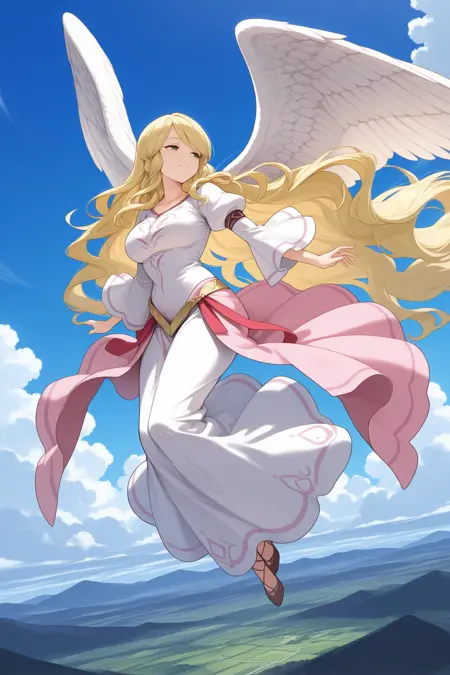 Add "deflnn, very long hair, wavy hair, blonde hair, green eyes, white wings, feathered wings, white dress, long dress, wide sleeves, juliet sleeves, pink overskirt, gold belt" for her regular look.