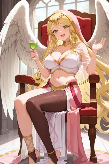 Add "htrlnn, very long hair, wavy hair, blonde hair, green eyes, white wings, feathered wings, pink veil, gold circlet, gold neck ring, see-through capelet, white crop top, gold trim, cleavage, midriff, pink skirt, white pelvic curtain, single leg pantyhose, toeless legwear" for Hatari Leanne.