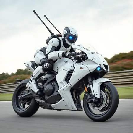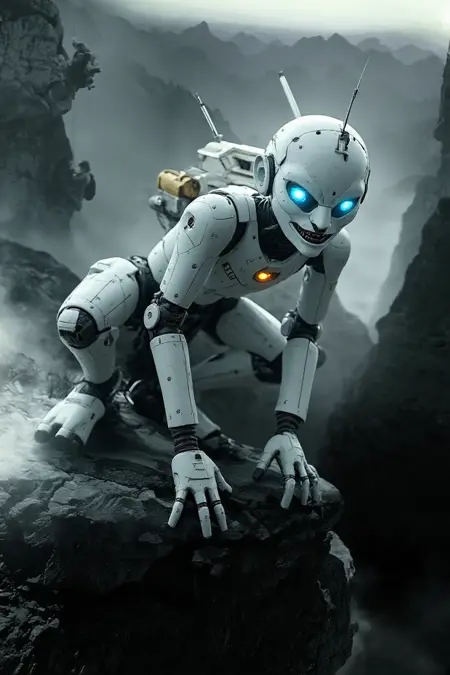 "Convert the [SUBJECT] to a white Kontext_H0riz0n machine with blue glowing eyes, retain pose****_"__