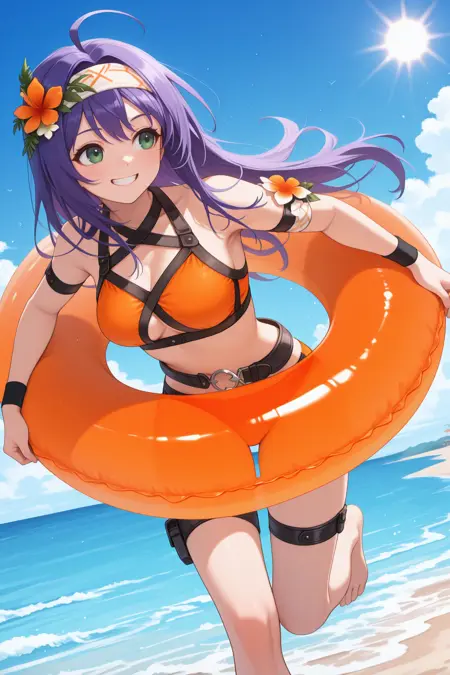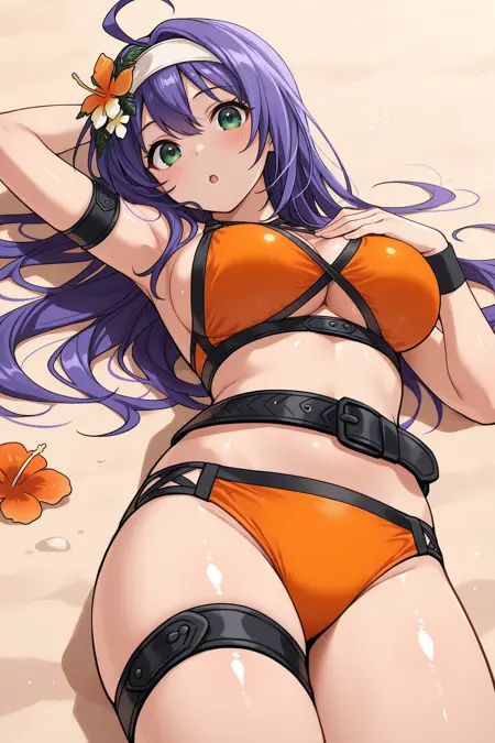 • Add "smsm1a, ahoge, blue hair, purple hair, long hair, green eyes, white hairband, hair flower, orange flower, orange bikini, arm strap, criss-cross halter, belt, wristband, thigh strap" for Summer Mia.