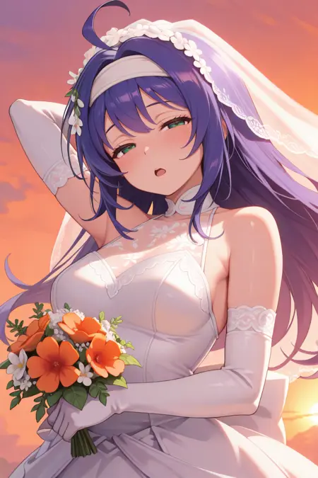 • Add "ykam1a, ahoge, blue hair, purple hair, long hair, green eyes, mask on head, white hairband, hair ornament, orange yukata, print yukata, detached sleeves, wide sleeves, black sash, sandals" for Yukata Mia.
