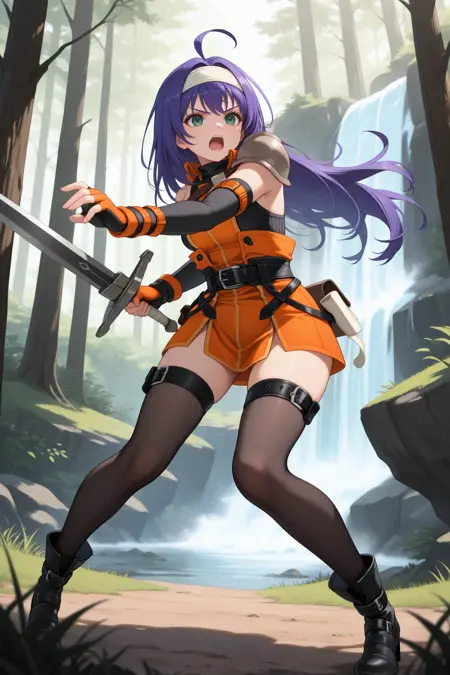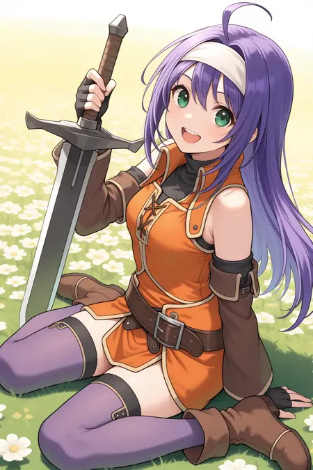 • Add "rdnm1a, ahoge, blue hair, purple hair, long hair, green eyes, white hairband, cross-laced tunic, orange tunic, detached sleeves, brown sleeves, black gloves, fingerless gloves, brown belt, purple thighhighs, brown boots, ankle boots" for her RD look.
