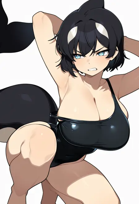 orca_cnr, 1girl, black hair, short hair,two-tone hair, bangs, blue eyes,cetacean tail,fins,large breasts,