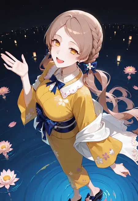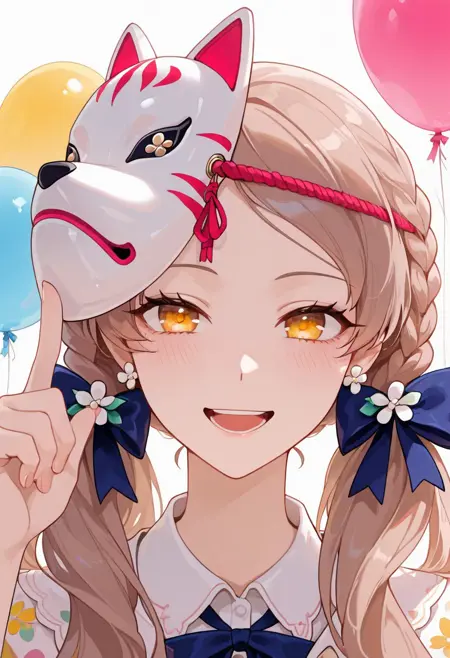 kanae_arcaea, light brown hair, long hair, wavy hair, hair braid, twintails, braided twintails, bow twintails, hair ornaments, blue bow, loose twintails, yellow yukata, yukata print, floral print, collared shirt, white garment, dark blue bow, obi, dark blue obi, patterned obi, checkered print obi, geta, blue geta, okobo sandals, white shawl, print shawl, shawl tied, shawl around waist, fox mask, kitsune mask,