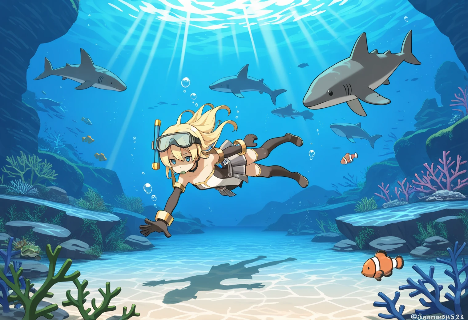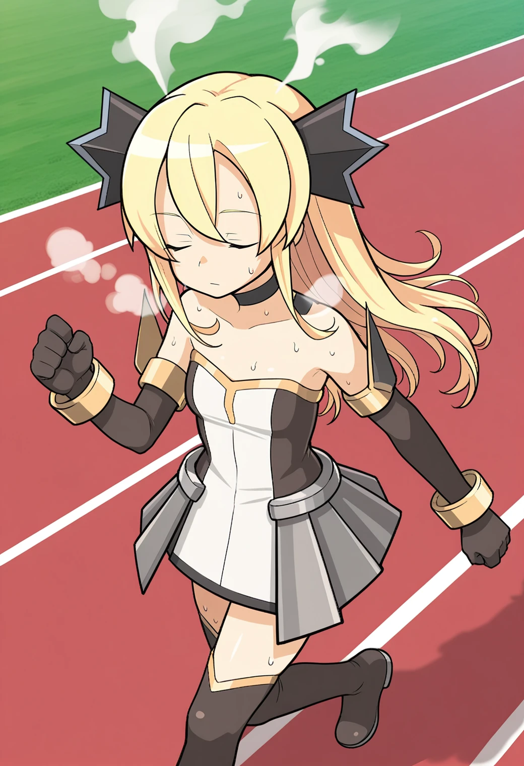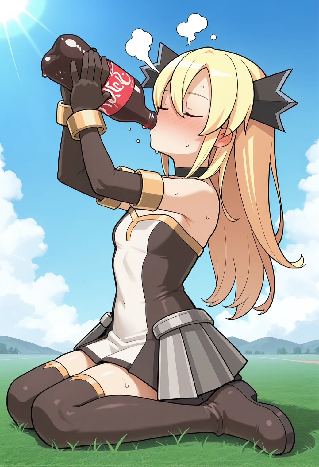 totomono1_Troo, blonde hair, long hair, choker, thighhighs, black thighhighs, gloves, elbow gloves, black gloves, dress, strapless dress, bare shoulders, boots, thigh boots, bracelet, jewelry,
