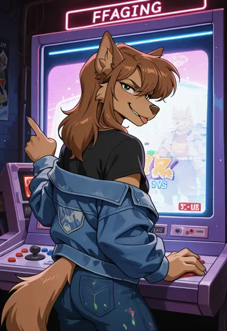 oliac, female, furry, anthro, black eyes, brown fur, brown body, brown nose, brown hair, short hair, canine, ears, tail,