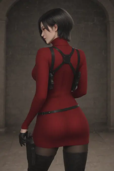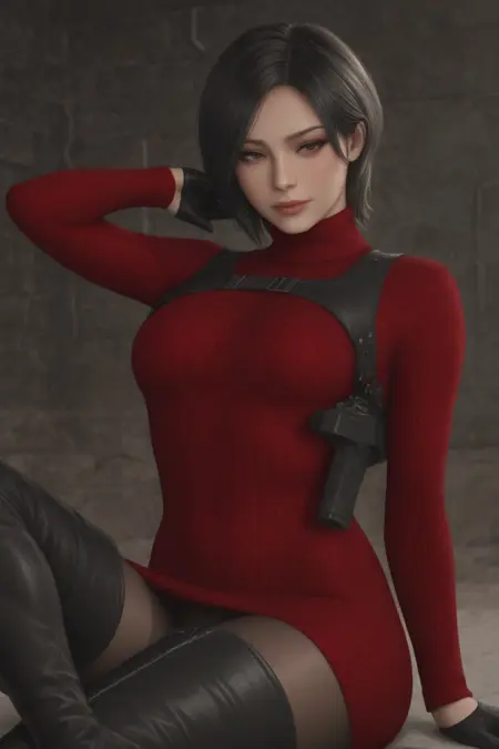 Trigger word:adawongre4re, 1girl, solo, brown eyes, black hair, short hair, gloves, black gloves, shoulder holster, bodysuit, sweater, red sweater, turtleneck sweater, turtleneck, dress, red dress, long sleeves, boots, high heels, thigh boots, high heel boots, black footwear, pantyhose, thighhighs, medium breasts,