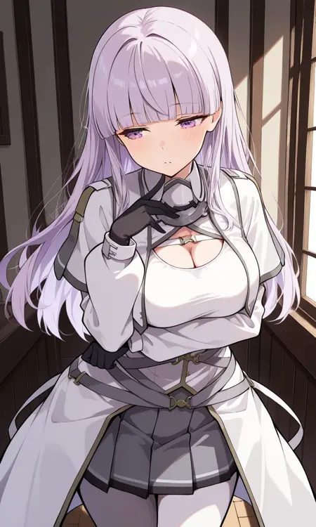 默认服装: kirovKC,浅紫色头发,灰色头发,长发,灰色裙子,长袖,帽子,露胸,百褶裙,黑色手套,齐眉刘海,毛皮镶边,白色头饰,白色连裤袜,白色外套,毛皮帽,